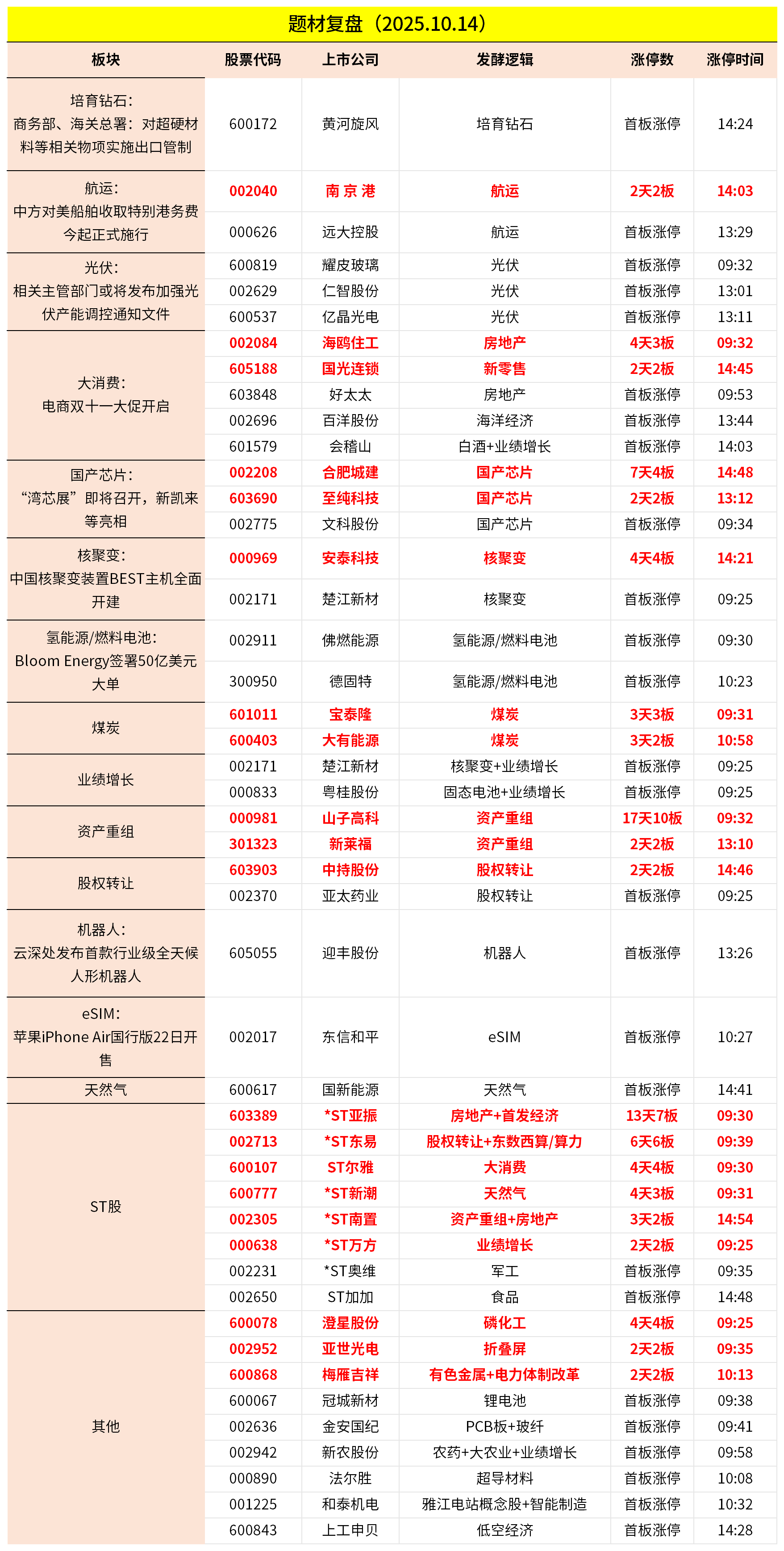 4、机器人 | 10月14日,中国外交部发言人林剑表示,国际机器人联合会此前发布的《2025年世界机器人报告》显示,2024年中国在役工业机器人存量突破200万台,居全球首位。与此同时,中国机器人正在汽车、电子、金属机械、家庭服务、医疗教育等领域展现出广阔应用前景,逐步从实验室走进工厂生产线和各国百姓家。