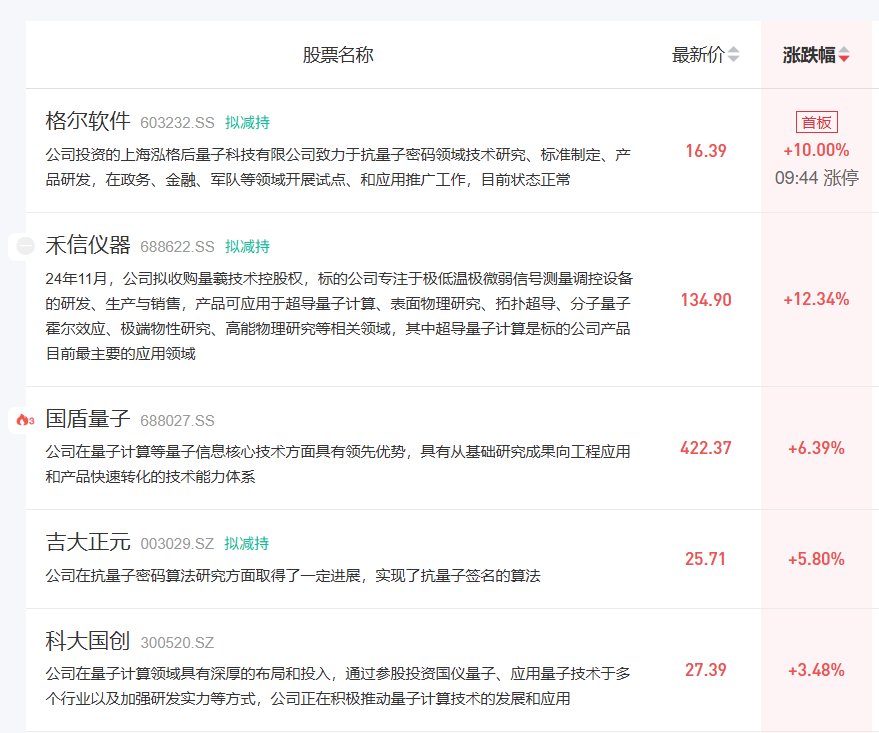 10月15日,量子科技板块迎来盘中大涨。格尔软件涨停,禾信仪器、国盾量子、吉大正元、科大国创等集体大涨。