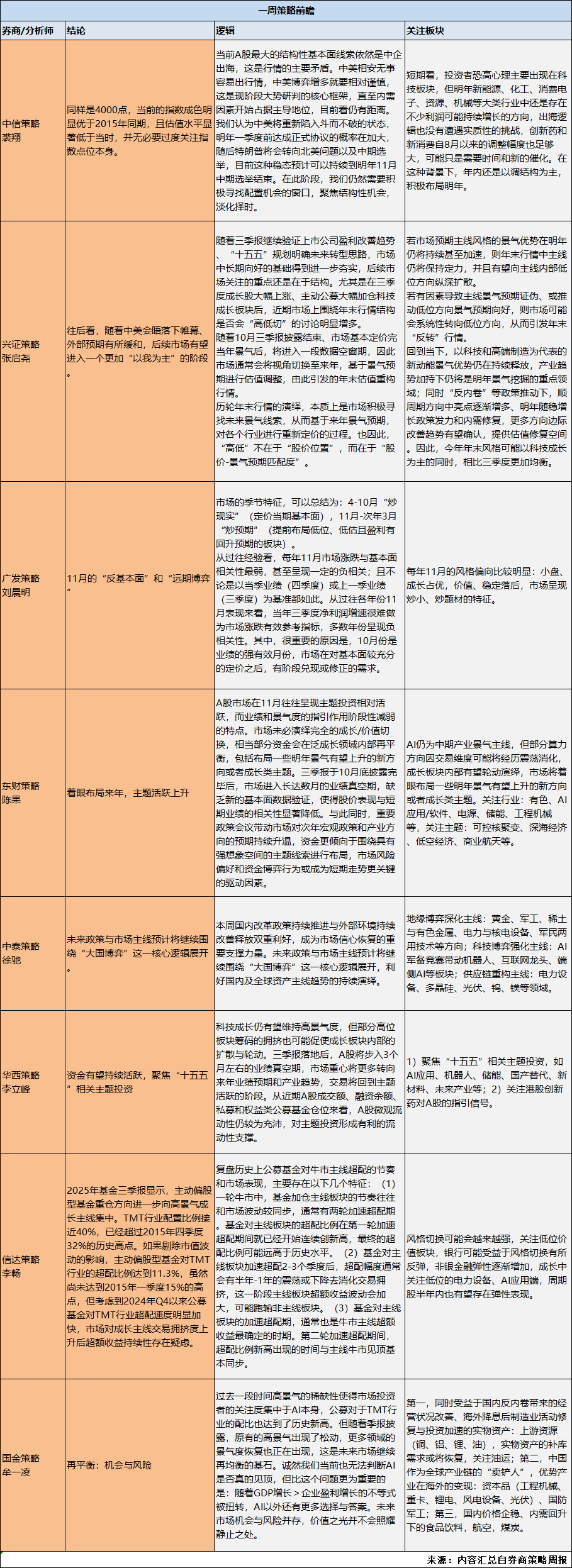 本周的券商策略观点讨论了两个焦点问题。一个是11月及年末的市场风格历史上是怎么样的?另一个是科技股高位震荡,后续会不会高低切?