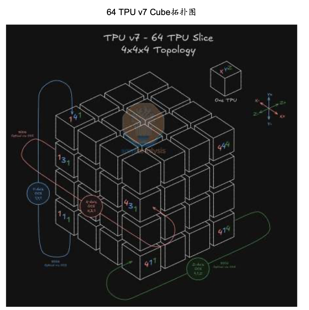 TPU(4,1,4)在Z+方向上没有内部相邻的TPU,因此它将使用一个800G光收发器,通过光纤连接至分配给Z轴的光路交换机(OCS),该OCS被配置为将此连接导向立方体的Z-侧,从而连接到TPU(4,1,1)。一个机架有6个外立面,每个外立面引出16条光互联链路,合计96条光互联链路。64个机架,96*64=6144条光互联链路;144个机架,合计13824(144*96)条光互联链路。