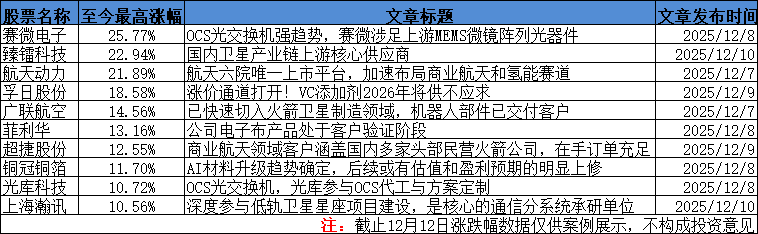 本周周初分享的OCS交换机和商业航天行业逻辑得到市场认可,周内持续表现。研报原文观点如下: