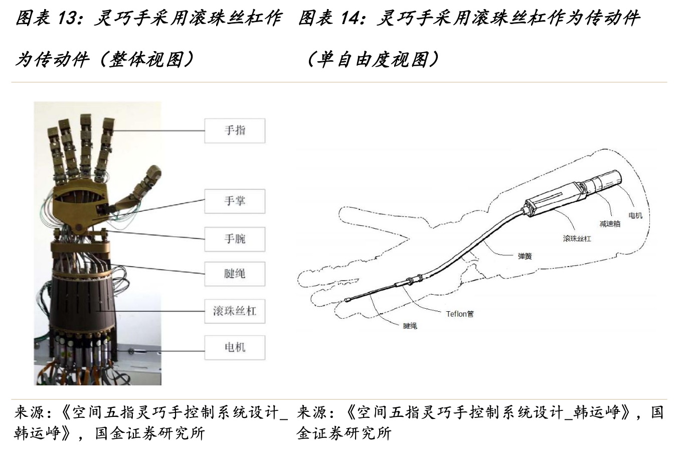 若按照每只手配置22个自由度计算,单只手可能配置22根丝杠。这意味着单个人形机器人(双手)将需要44根丝杠。丝杠作为承载力最高的传动方案,在精细化和重负载工作场景中具备必要性,预计将带动丝杠产业链相关企业的高速发展。