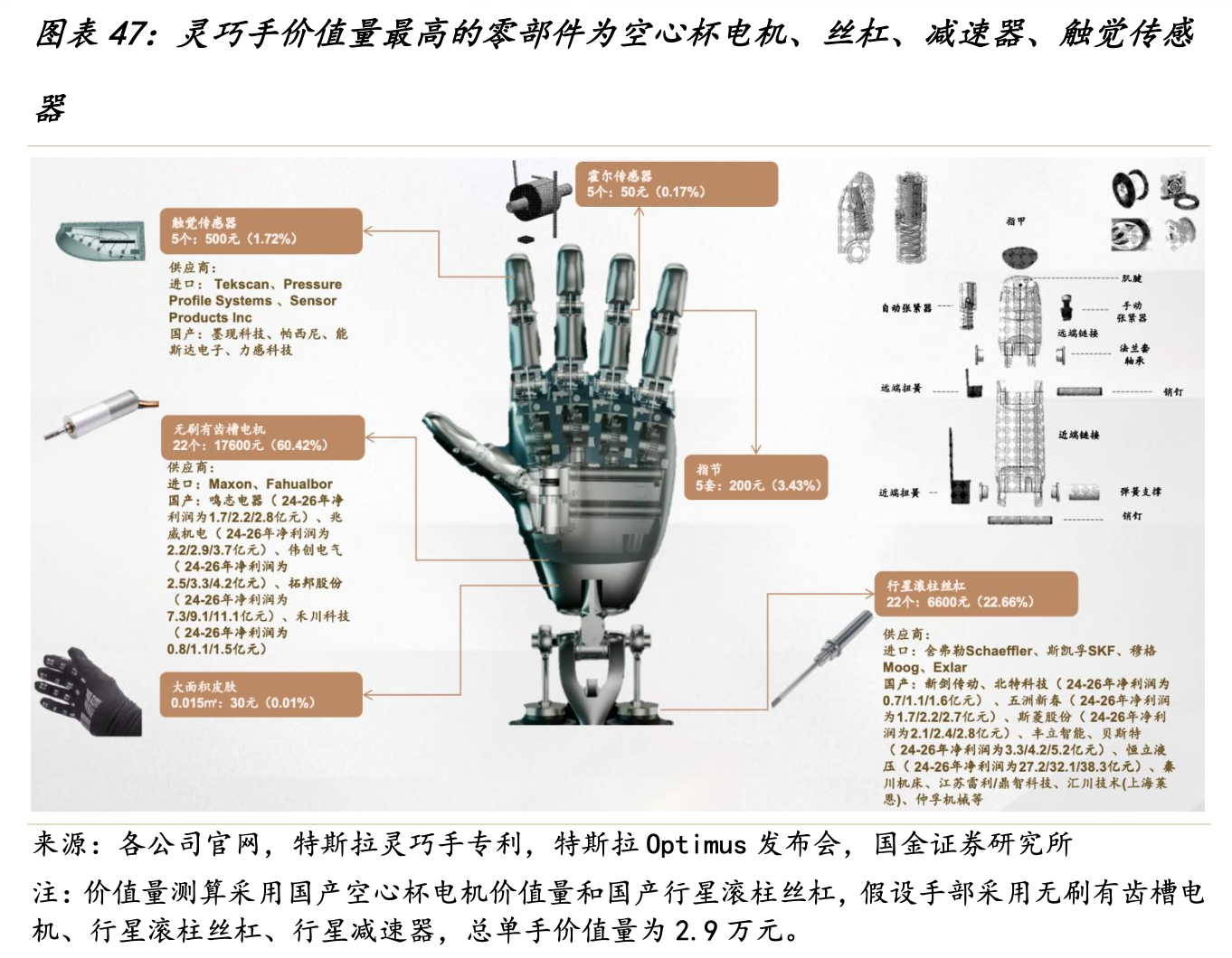 灵巧手是人形机器人成本占比最高的零部件之一,约占整机成本的20%-30%。除了丝杠,电机和传感器也是核心。