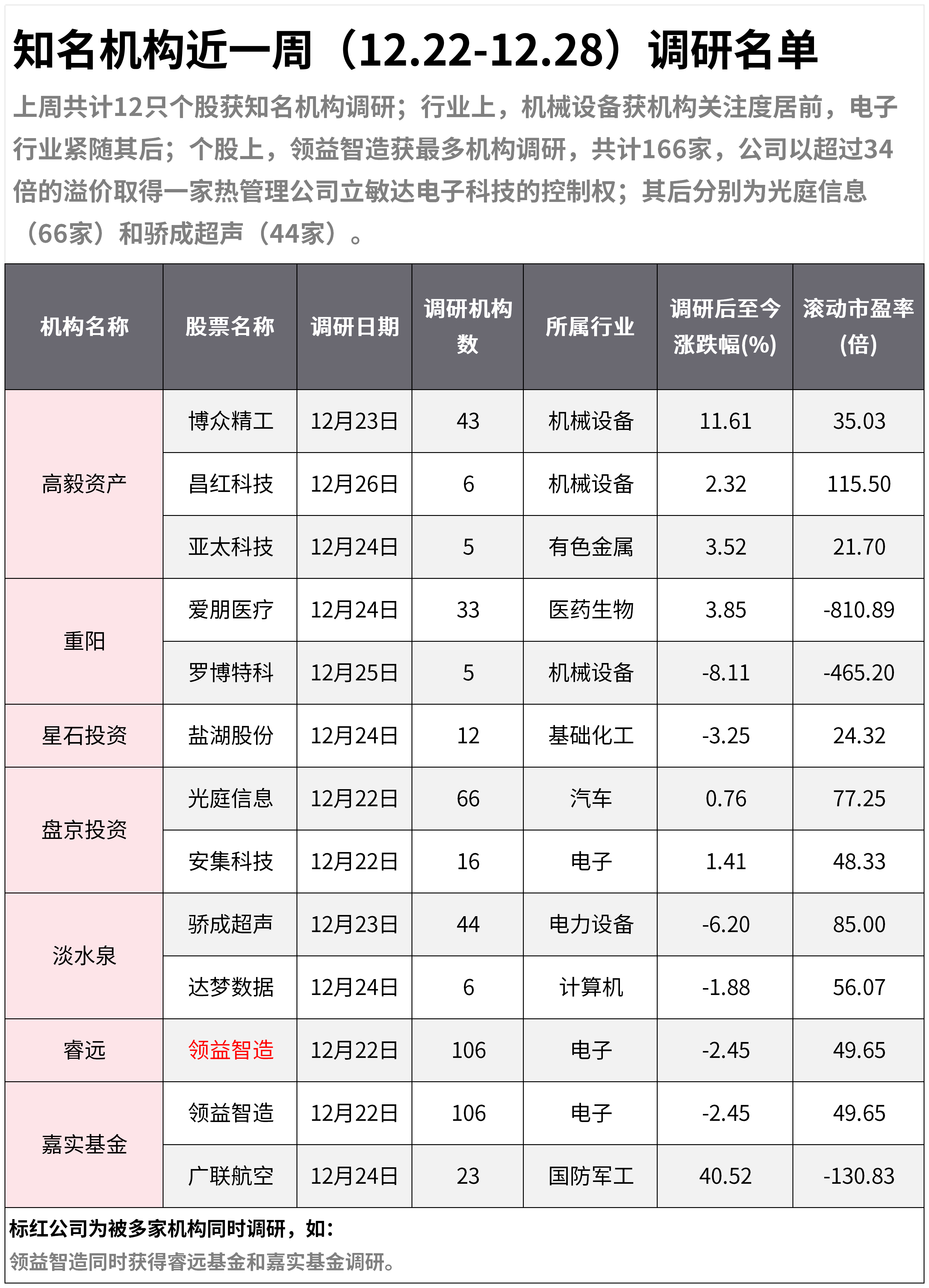 上周共计12只个股获知名机构调研;行业上,机械设备获机构关注度居前,电子行业紧随其后;个股上,领益智造获最多机构调研,共计166家,公司以超过34倍的溢价取得一家热管理公司立敏达电子科技的控制权;其后分别为光庭信息(66家)和骄成超声(44家)。