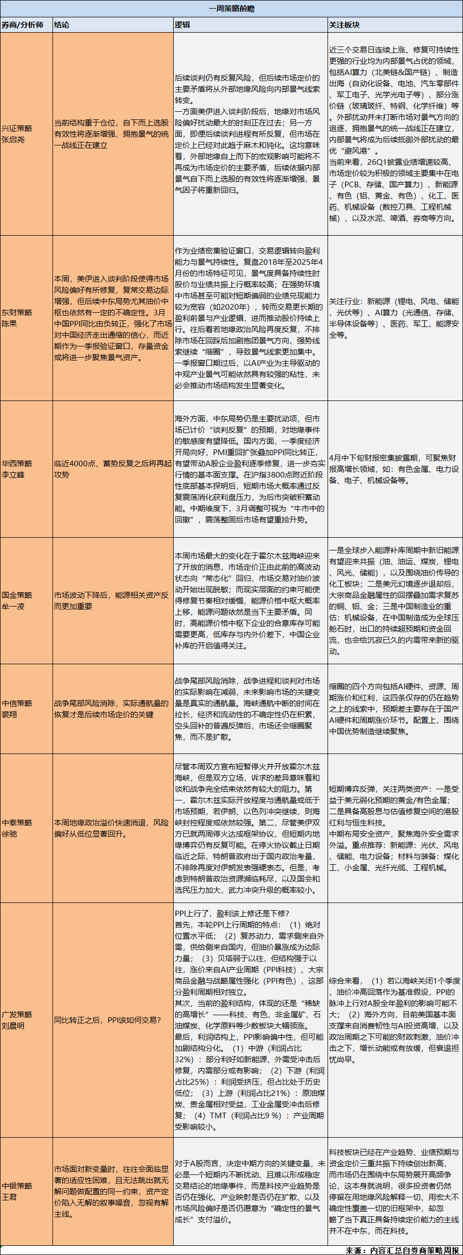 兴证策略张启尧团队指出,后续谈判仍有反复风险,但后续市场定价的主要矛盾将从外部地缘风险向内部景气线索转变。