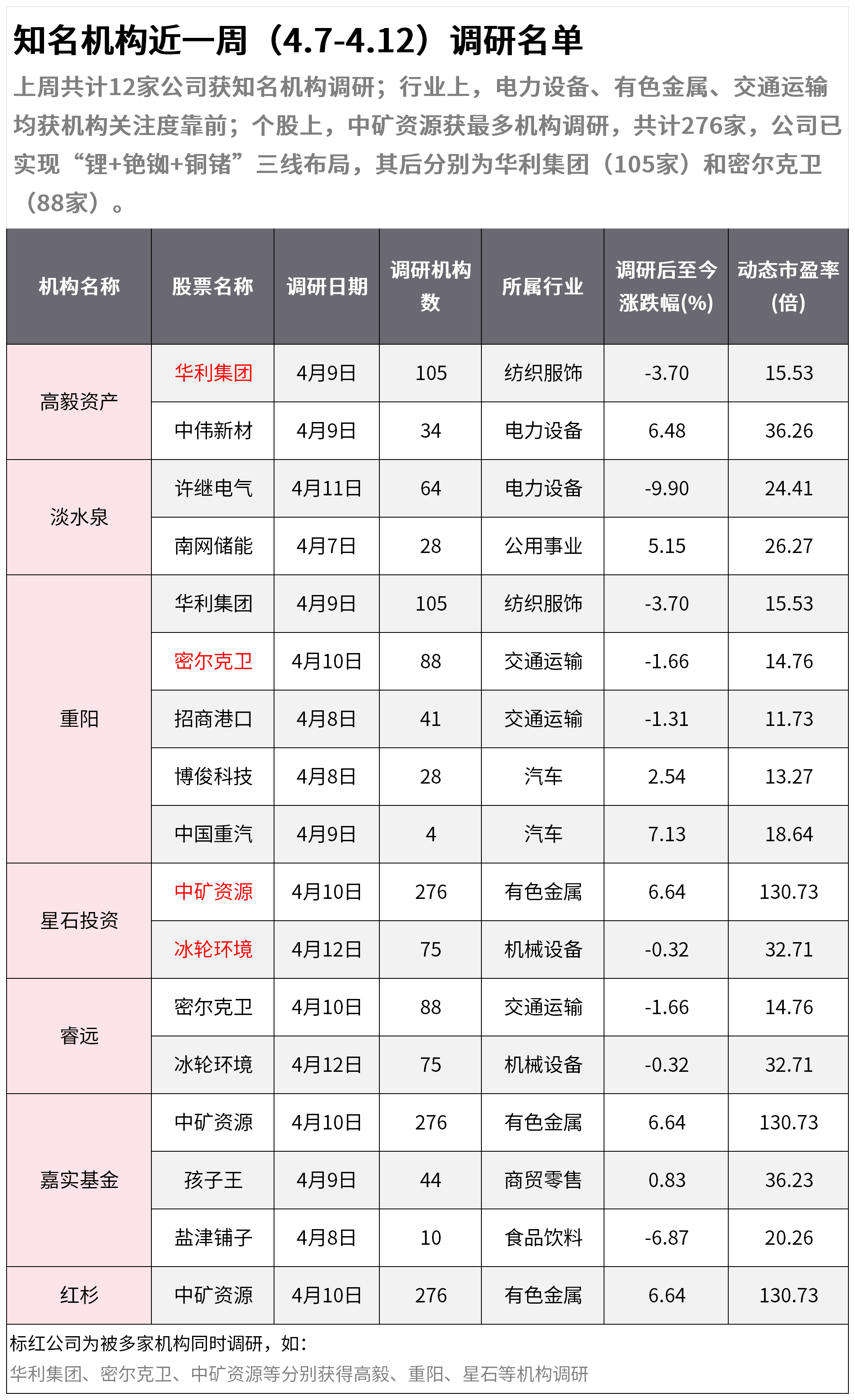 上周共计12家公司获知名机构调研;行业上,电力设备、有色金属、交通运输均获机构关注度靠前;个股上,中矿资源获最多机构调研,共计276家,公司已实现“锂+铷+铜锗”三线布局,其后分别为华利集团(105家)和密尔克卫(88家)。