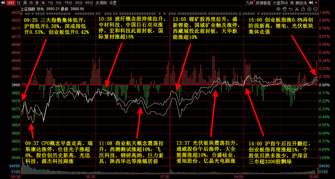 截至收盘,沪指、深成指、创业板指分别收涨0.06%、0.69%、0.8%,市场近3000股下跌,2300余股上涨,三市累计成交额超2.1万亿。