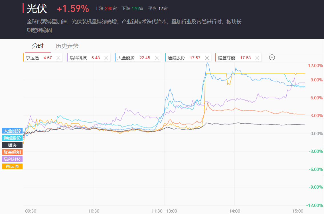 午后光伏概念同样随期货局部反弹,京运通、通威股份(炸)涨停,晶科科技、大全能源、中信博、合盛硅业、晶澳科技、隆基绿能等集体大涨;