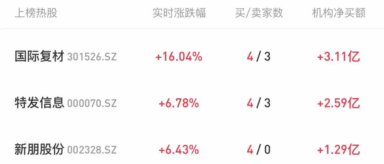 今天机构龙虎榜上榜31只个股,净买入14只,净卖出17只。当日机构买入最多的个股前三位是:国际复材(3.11亿)、特发信息(2.59亿)、新朋股份(1.29亿)。